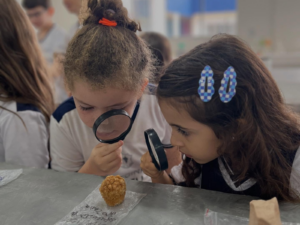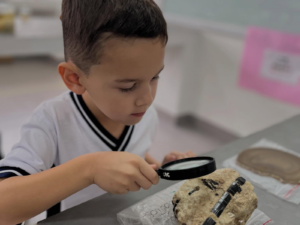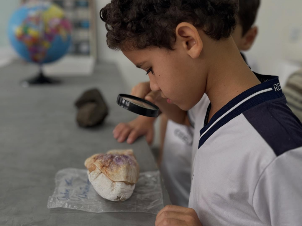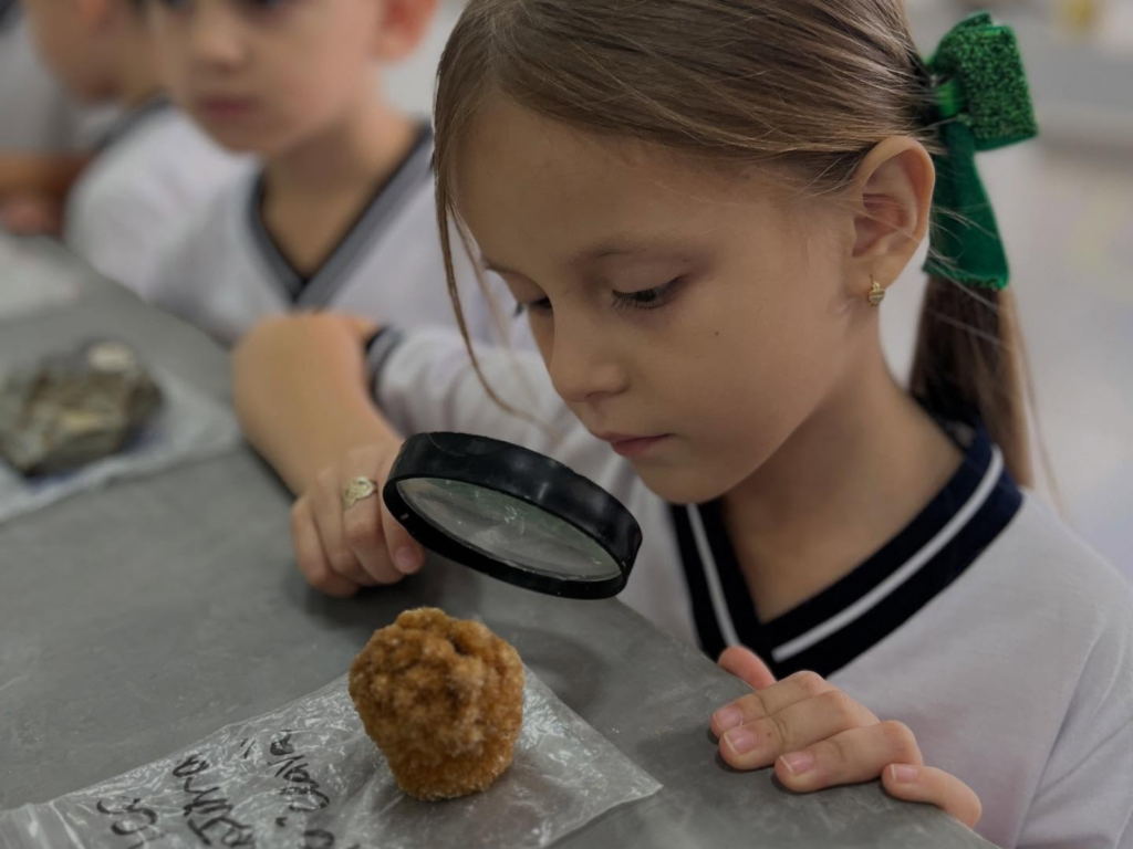 As crianças observaram minerais de perto, acompanharam experiências químicas e investigaram detalhes surpreendentes em lâminas ampliadas, uma vivência inesquecível que aprimora o olhar e o conhecimento.